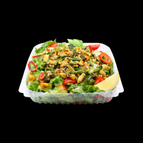 Red and green leaf romaine lettuce, cucumber, Fresno peppers, cherry tomatoes, with (grilled) asparagus, yellow squash, Zucchini, and corn, topped with our house made sherry vinaigrette dressing.
